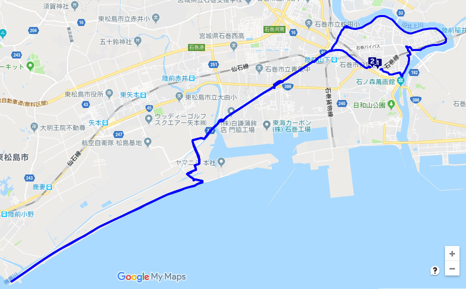 復興事業真っ只中って感じの海岸線。石巻~鳴瀬川までの防潮堤の上をスイスイ。